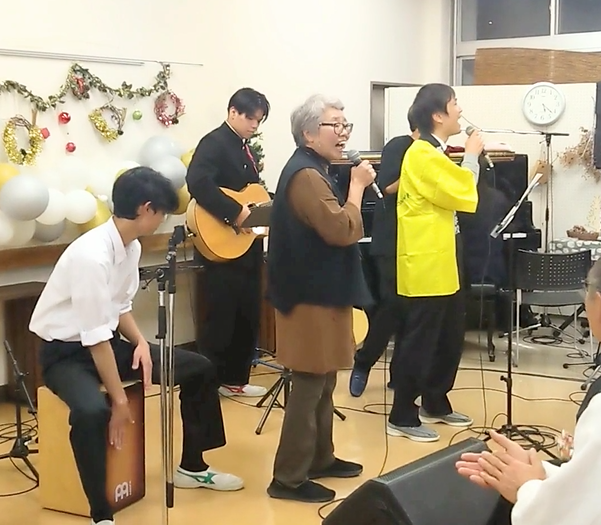 音楽部と先生のコラボ演奏。卒業された先生の熱いライブ!香月ジュニア合唱団の子どもたちと「赤鼻のトナカイ」を大合唱。